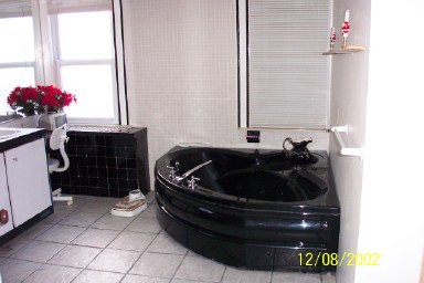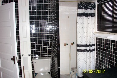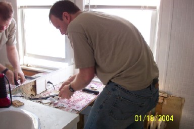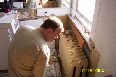 Well, after Sherry painted the tiles white in this room, and added curtains, nothing much changed. Until Sunday January 18, 2004. This is when I started hearing noised from upstairs, banging, stuff falling. Tiles falling. It seems that with the recent cold weather, Sherry decided to 'uncover' the radiator in this room from its own little box. Turns out it was a little more work than originally thought.