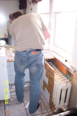 Removing the hand-built counter and radiator box (complete with little holes to let the heat try to get out) was quite the chore. With everything tied together (with nails) and the desire to not hurt the radiator or windowsill, it took a bit of careful pursuasion.